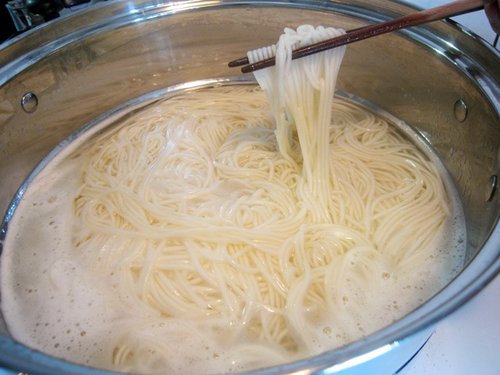 把節能鍋裡半鍋的水倒過去主鍋當麵湯