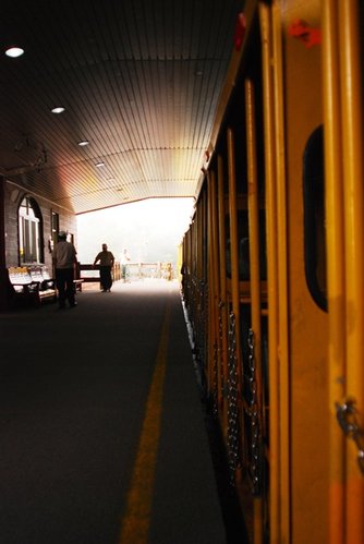 等遊客們坐上蹦蹦車 安全鐵鍊也全扣上 車即將駛出車站時