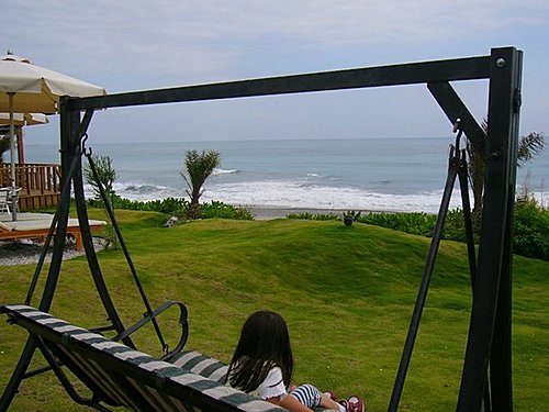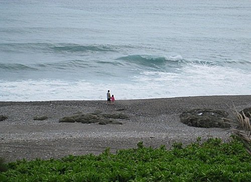 孩子滿足的吃完早餐後 就迫不及待又溜下緩坡 親近大海