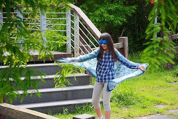 她高舉雙手兼墊腳尖才只能摸到垂墜的袖口尖而已
